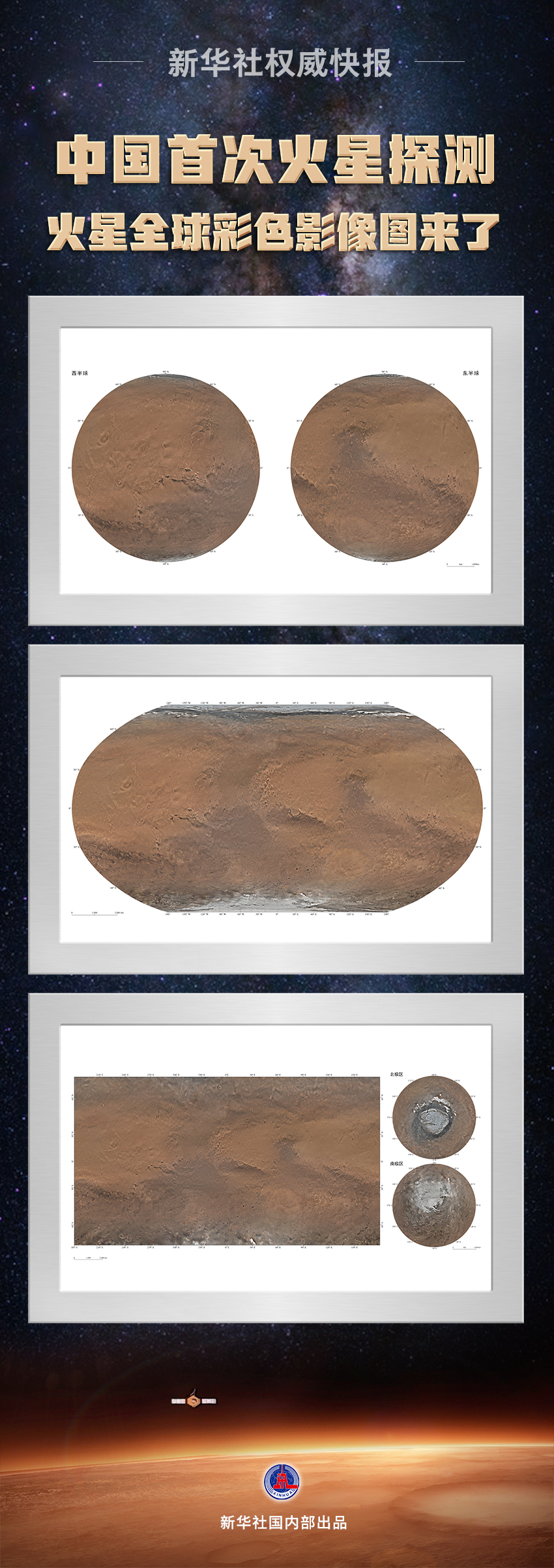 本次发布的影像图为彩色,包括按照制图标准分别制作的火星东西半球正射投影图、鲁宾逊投影图和墨卡托投影加方位投影图,空间分辨率为76米,将为开展火星探测工程和火星科学研究提供质量更好的基础底图。