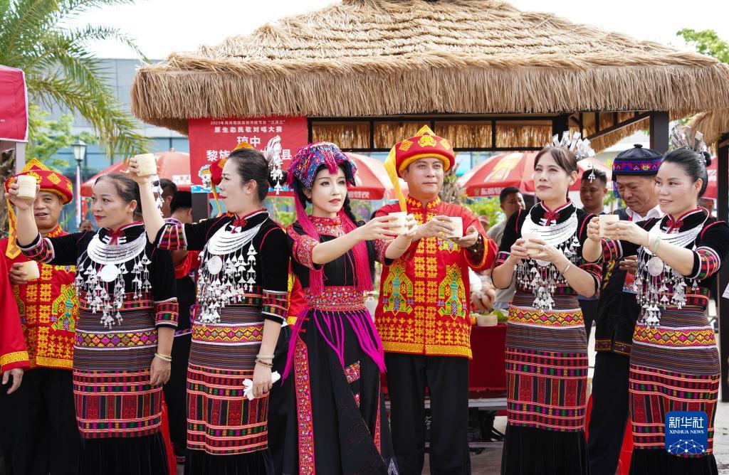 4月23日,在海南省乐东黎族自治县,黎族同胞共饮山兰酒庆祝“三月三”。