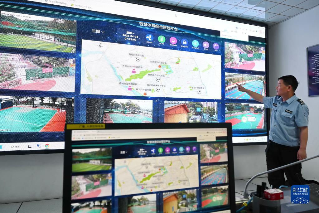 4月24日,西河智慧体育公园工作人员在介绍智慧体育综合管控平台。该平台可对公园内的人流、安全、环境以及公园周边“15分钟健身圈”运动场地的门禁、灯光等设备实现智能化管理。