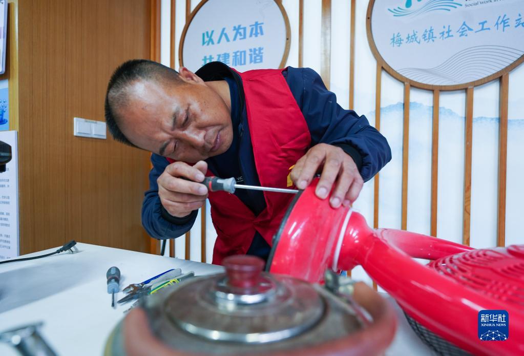 4月24日,在建德市梅城镇古街,社区志愿者为居民提供修理电器服务。