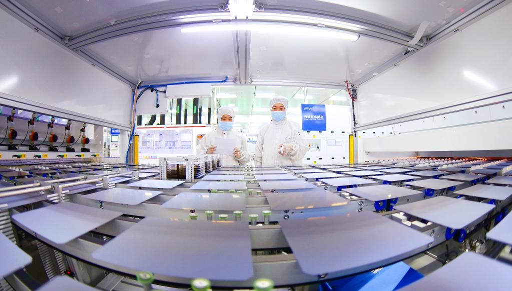 在晶澳太阳能科技股份有限公司,工作人员正在记录智能化生产线运行情况。新华社记者岳文婷 摄