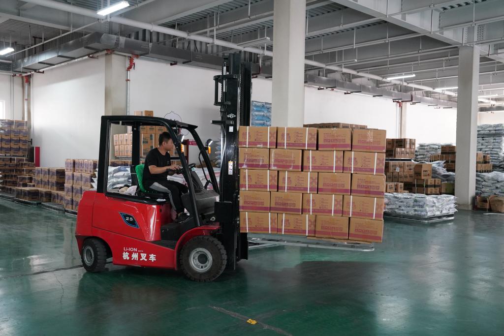工人在华兴宠物食品有限公司仓库内拖运宠物食品。新华社记者岳文婷 摄