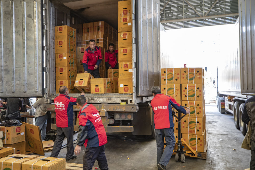 在重庆市江津区双福农贸城,洪九果品的工作人员在搬运从泰国运输过来的榴莲(2022年4月19日摄)。新华社记者 黄伟 摄