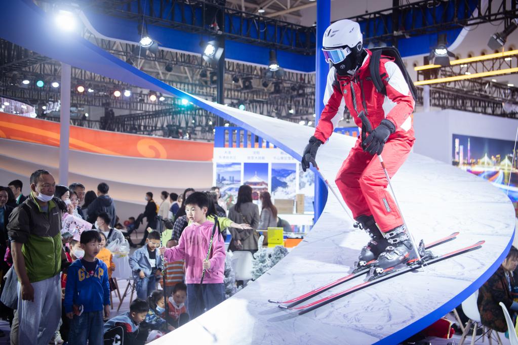 4月22日,观众在第二届文旅博览会辽宁馆体验冰雪运动装备。新华社记者 伍志尊 摄