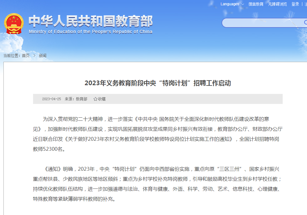 记者4月25日从教育部获悉,教育部办公厅、财政部办公厅近日联合印发通知,对2023年农村义务教育阶段学校教师特设岗位计划实施工作进行部署,明确全国计划招聘中央“特岗计划”教师52300名。
