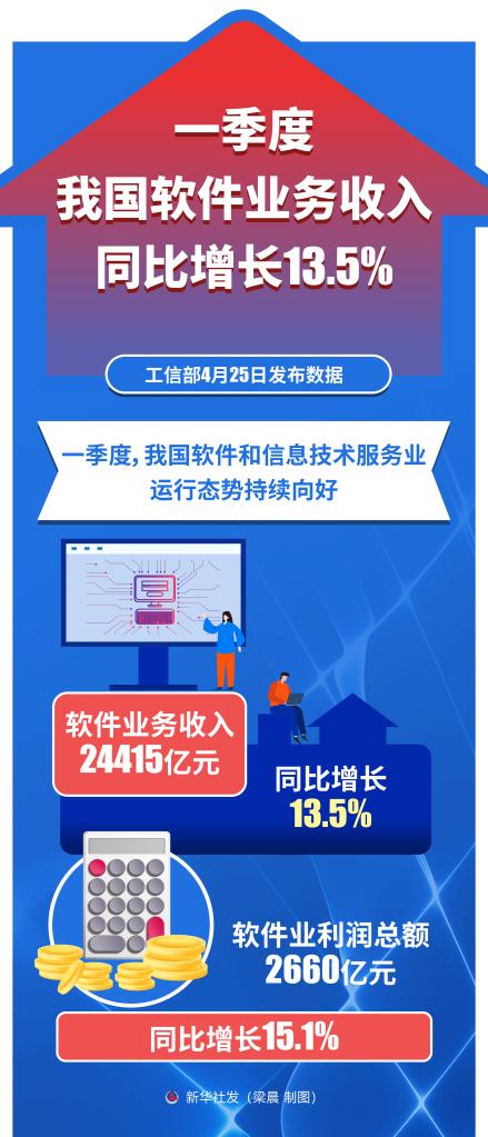 新华社北京4月25日电(张辛欣、姚一铭)工信部25日发布数据:一季度,我国软件和信息技术服务业运行态势持续向好,软件业务收入24415亿元,同比增长13.5%,软件业利润总额2660亿元,同比增长15.1%。