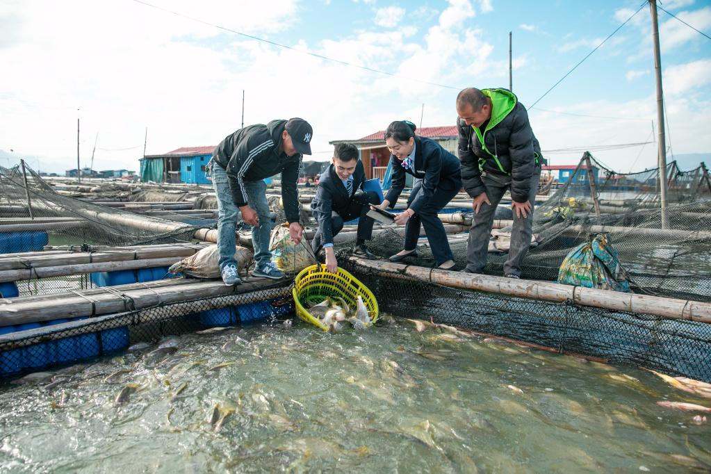 银行工作人员深入海上渔排了解养殖情况。新华社记者秦宏 摄