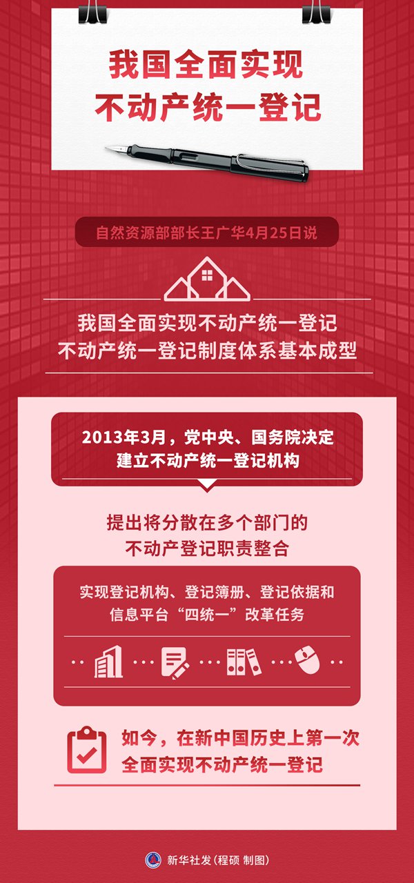 新华社成都4月25日电(记者王立彬)自然资源部部长王广华25日说,经过十年不懈努力,我国全面实现不动产统一登记,不动产统一登记制度体系基本成型。
