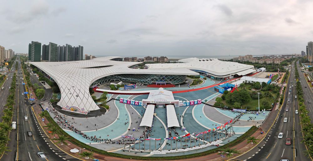 4月14日,观众有序排队进场(无人机照片)。当日,第三届中国国际消费品博览会迎来社会公众开放日,吸引观众前来观看展览、选购商品。新华社记者 杨冠宇 摄