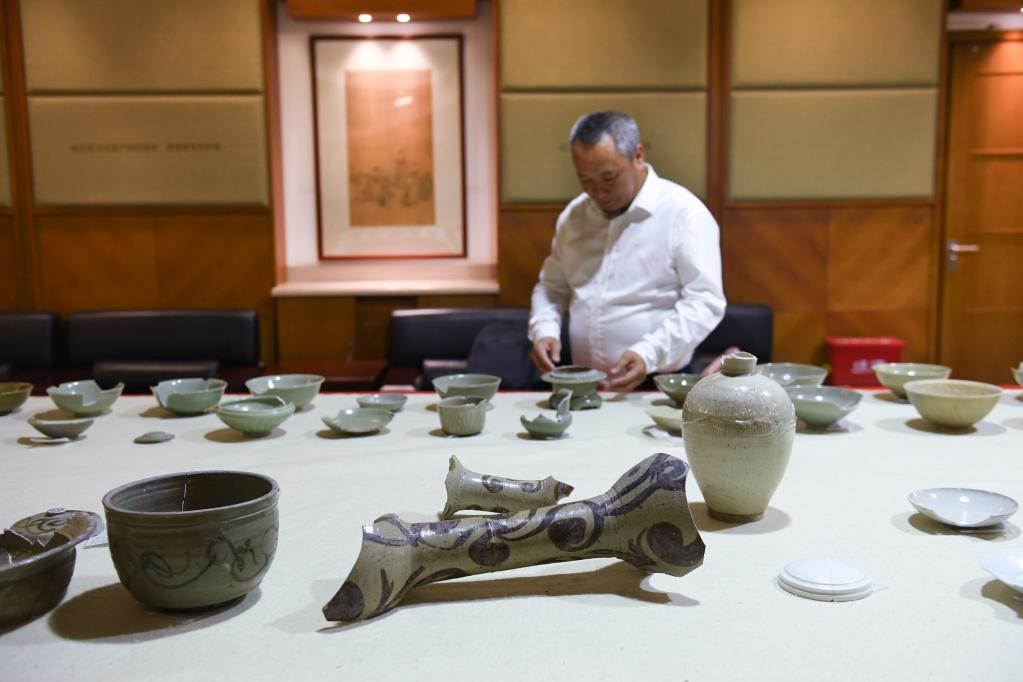 考古工作者在温州市博物馆库房点阅温州朔门古港遗址出土陶瓷器(2022年10月11日摄)。新华社记者翁忻旸 摄