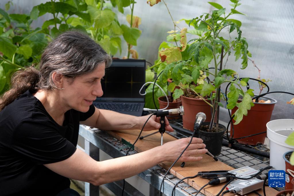 4月19日,在以色列特拉维夫大学乔治·S·怀斯生命科学学院的大棚实验室,该学院植物科学与食品安全系教授莉拉赫·哈达尼介绍植物“说话”的研究成果。新华社记者 陈君清 摄