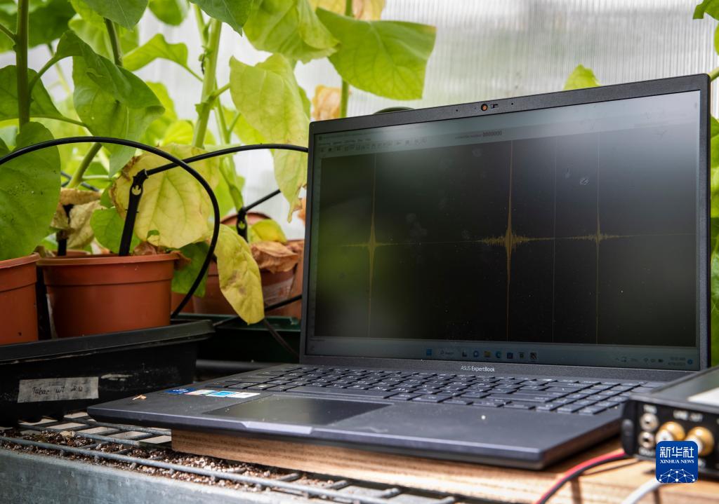 4月19日,在以色列特拉维夫大学乔治·S·怀斯生命科学学院的大棚实验室,植株发出的声音通过超声波麦克风转换为电信号后在电脑屏幕上以声波波形显示。新华社记者 陈君清 摄