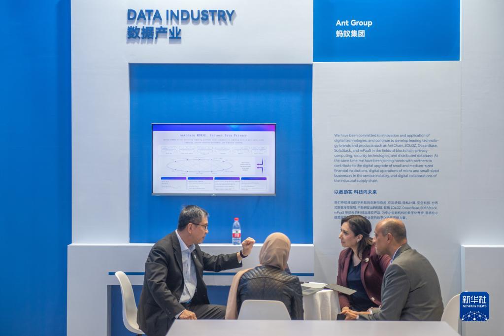 4月26日,在数据产业展区,蚂蚁集团代表(左一)为参观者讲解。