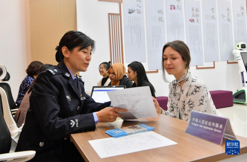 4月26日,在天津工业大学出入境事务服务中心,天津市公安局出入境管理局民警为学校外国留学生讲解填报说明。