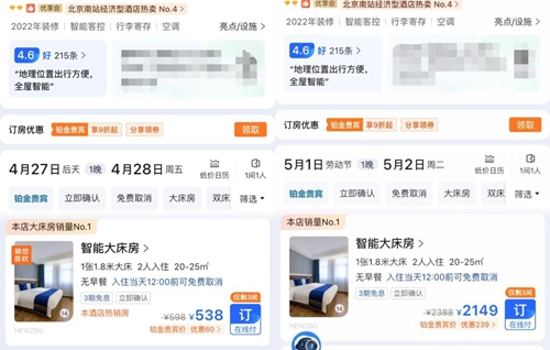 而这一轮涨价潮中,经济型酒店的房价涨幅尤其突出。位于北京珠市口地铁站旁的一家经济型酒店,智能大床房平日售价在500元左右,4月29日入住为1699元,5月1日则涨到2149元。