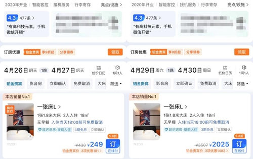 西安热门旅游景区大雁塔旁的一家精品酒店,18平方米的大床房平日价249元,4月29日、4月30日和5月1日入住的价格均高达2025元,几乎在平日价后面直接加了个零。有受访者表示,四位数住这样的酒店,实在无法接受。专家建议,节假日酒店房价上涨虽然受市场供需影响,但也需要考虑涨价幅度的合理性,剧烈的酒店价格波动不利于维护市场的良好秩序。