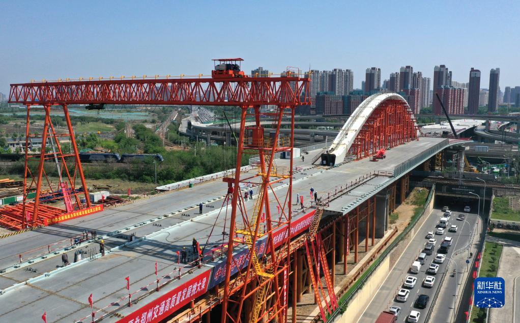 这是钢箱梁合龙后的郑州北三环新建彩虹桥(4月27日摄,无人机照片)。
