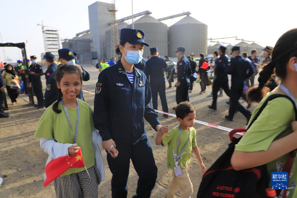 当地时间4月26日,中国海军导弹驱逐舰南宁舰、综合补给舰微山湖舰紧急驶赴苏丹,执行撤离我在苏丹人员任务。这是任务官兵在码头引导撤离人员登舰。