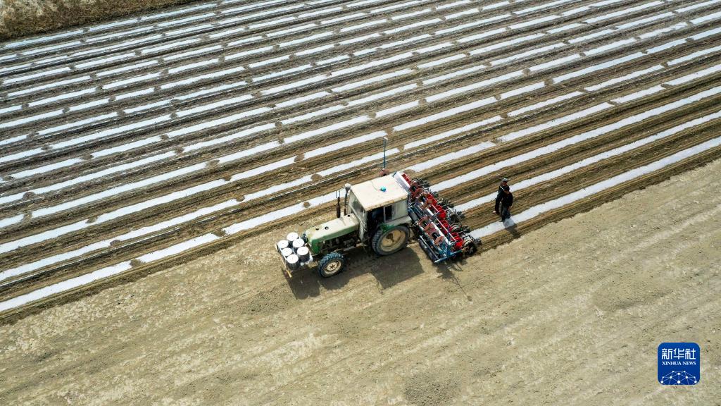 新疆尉犁县巴西买里村,尔肯·热衣木驾驶拖拉机春播(4月17日摄,无人机照片)。