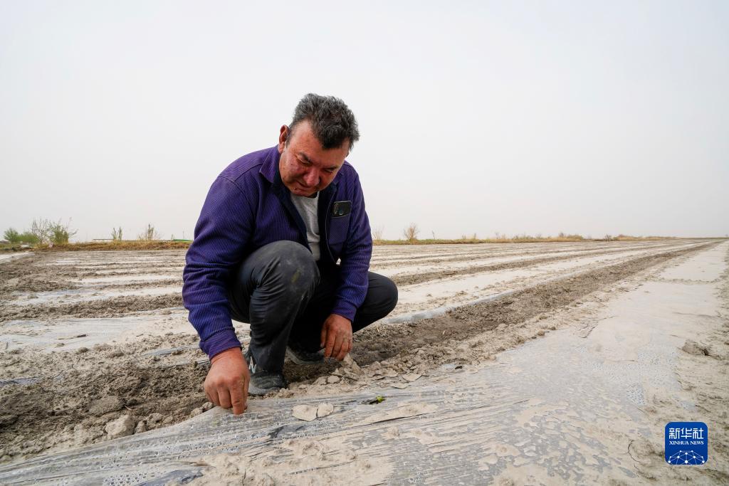 新疆尉犁县巴西买里村,尔肯·热衣木在棉田里查看棉花嫩芽生长情况(4月22日摄)。