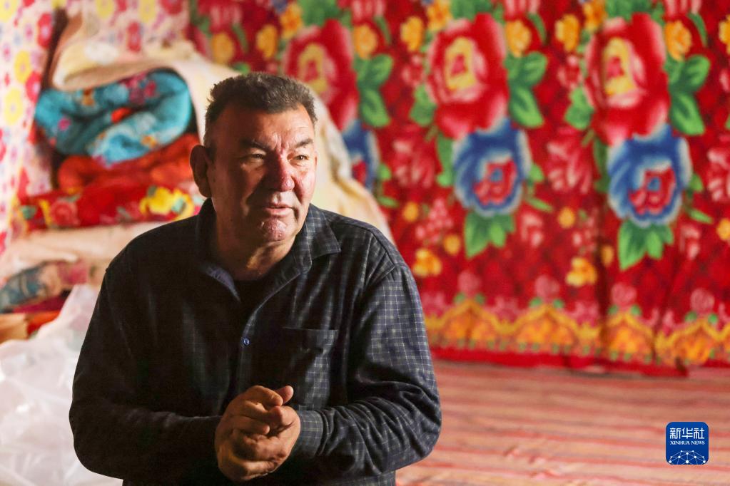 新疆尉犁县,在弟弟家,尔肯·热衣木和家人聊天(4月1日摄)。