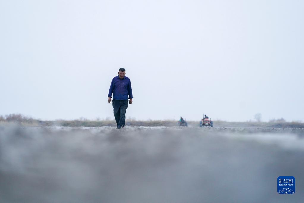 新疆尉犁县巴西买里村,尔肯·热衣木走在棉田里查看棉花嫩芽生长情况(4月21日摄)。