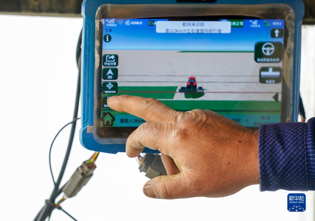 新疆尉犁县巴西买里村,尔肯·热衣木在操作北斗导航系统(4月21日摄)。