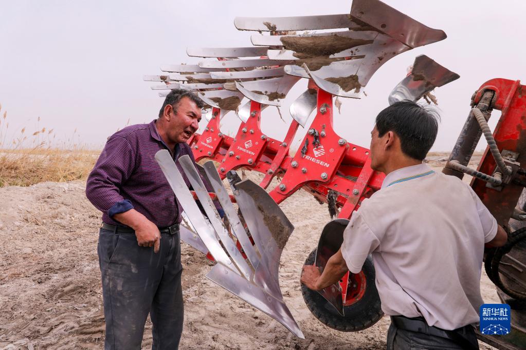 新疆尉犁县巴西买里村,尔肯·热衣木(左)检查犁地用的工具(4月17日摄)。
