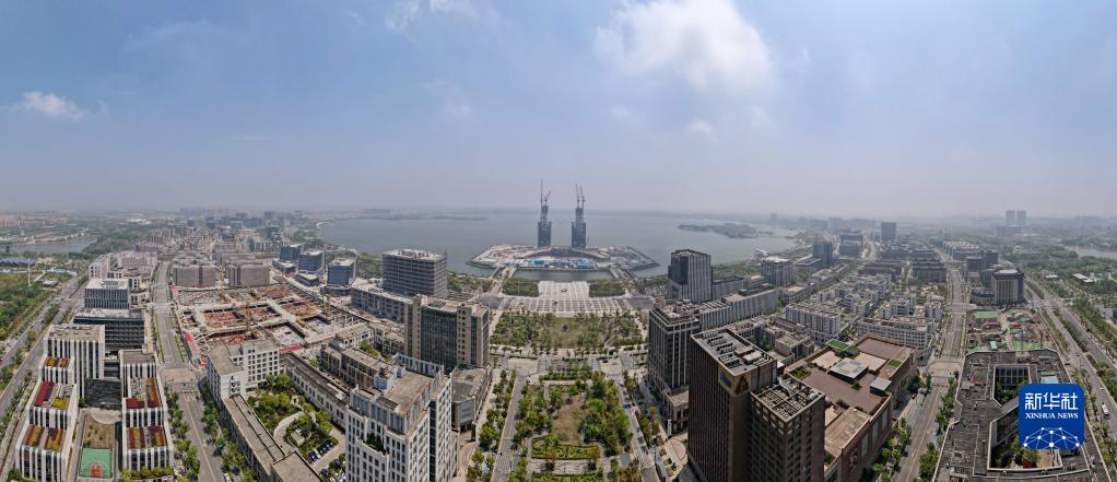 4月27日拍摄的临港西岛中银金融中心项目建设工地(中)(无人机全景照片)。