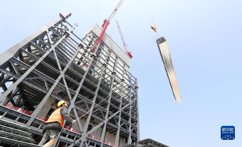 4月27日,一名工人在临港西岛中银金融中心项目南塔楼下辅助塔吊进行建筑材料吊装作业。