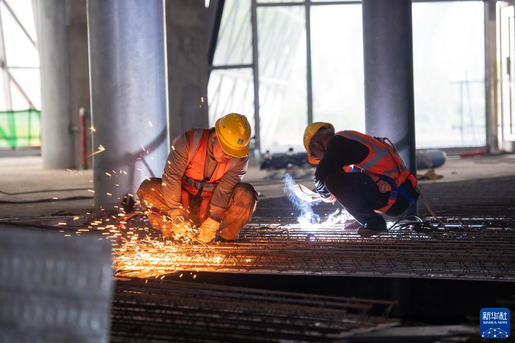 4月28日,在郴州市文体中心建设工地,中建五局装饰公司工人在进行钢结构桁架楼层板安装作业。