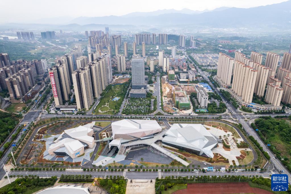 这是4月28日拍摄的建设中的郴州市文体中心(无人机照片)。