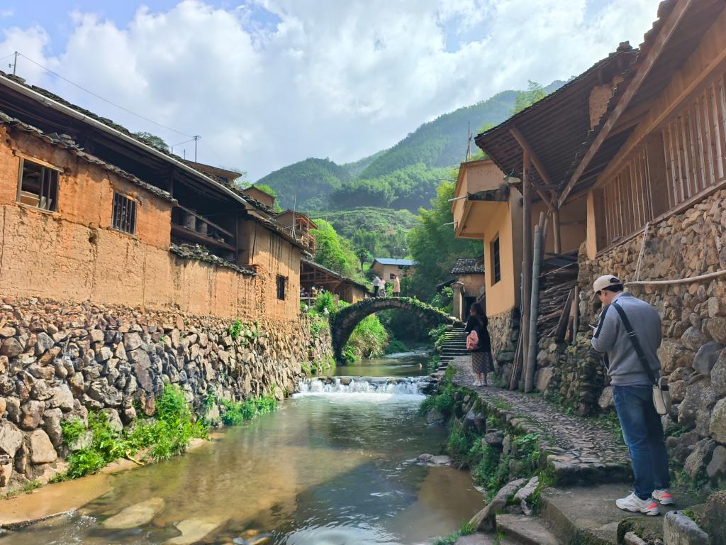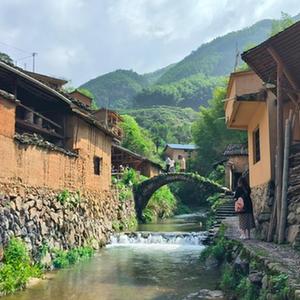 地处山坳的松庄村,是一个傍水古村落。走过村口一片茂盛林木后,七八十栋泥墙屋映入眼帘,循鹅卵石铺就的阶梯而下,一条潺潺流水呈“S”形绕村而过,不远处一座石拱桥横亘在溪流之上。