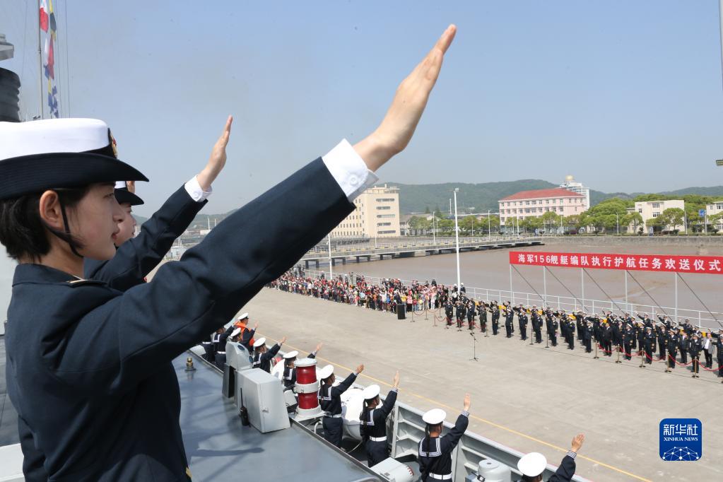 4月28日,中国海军第44批护航编队从浙江舟山某军港解缆起航,官兵们挥手告别。