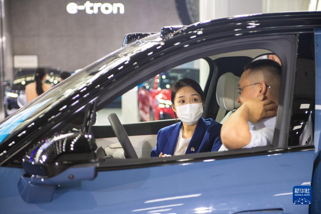 4月28日,工作人员(左)向观众介绍汽车功能。