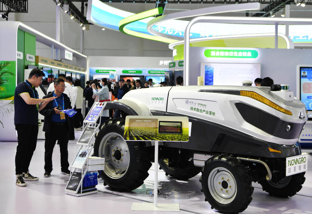 在第六届数字中国建设峰会智慧农业展厅展出的新能源无人驾驶智能拖拉机吸引参观者驻足观看(4月26日摄)。新华社记者 魏培全 摄