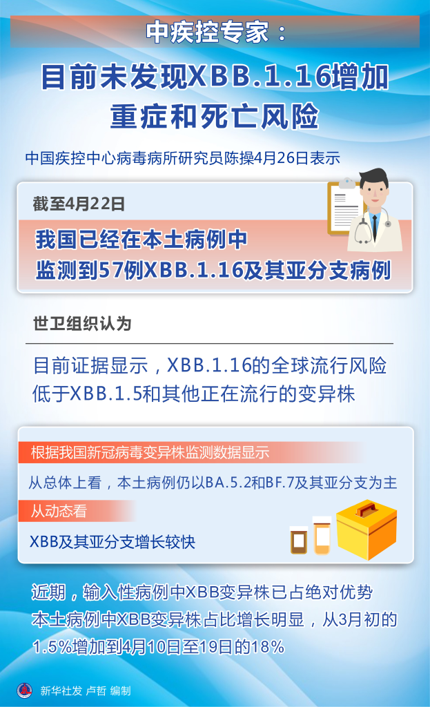 中国疾控中心病毒病所研究员陈操说,目前没有因感染XBB.1.16而导致重症入院和死亡增加的报道,与其他奥密克戎亚分支相比,也没有看到疾病严重程度增加的报道。中国疾控中心将密切关注和分析未来变化的趋势。