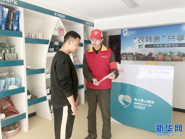 国网浙江电力(洞头)红船共产党服务队队员在电力爱心超市内协助村民兑换商品。新华网发 国网温州市洞头区供电公司供图