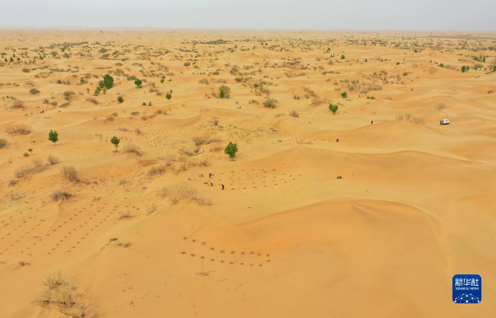 治沙客在内蒙古库布其沙漠亿利生态治理区种植苗木(4月27日摄,无人机照片)。