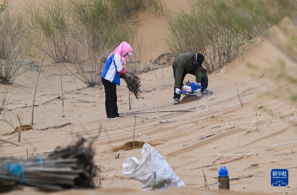 治沙客周斌禄(右)和妻子在内蒙古库布其沙漠亿利生态治理区种植苗木(4月27日摄)。