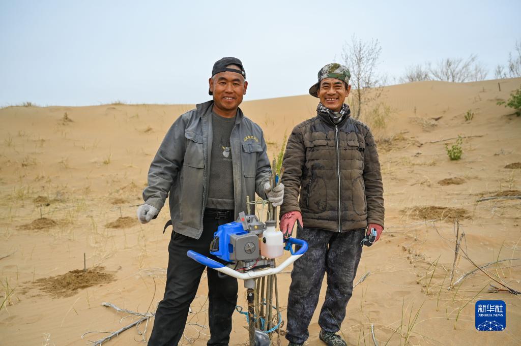 这是治沙客毛福平(左)和老乡刘金成在内蒙古库布其沙漠亿利生态治理区中的合影(4月27日摄)。