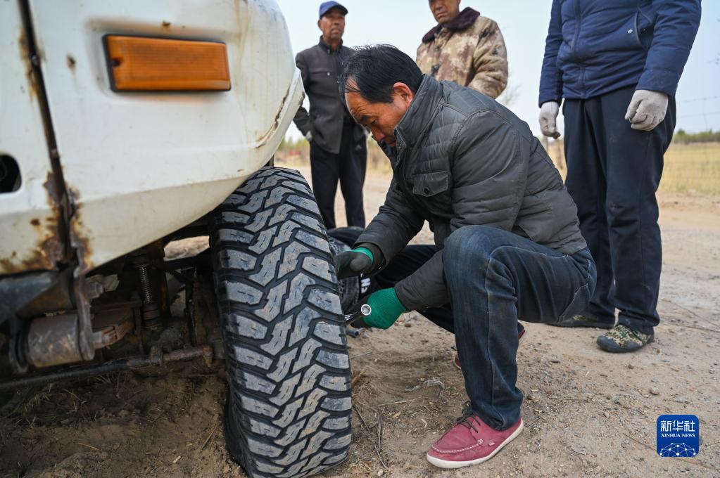 在内蒙古库布其沙漠亿利生态治理区,来自甘肃的朱虎明在修理汽车(4月26日摄)。今年,他带着20多名老乡来到库布其沙漠亿利生态治理区治沙。