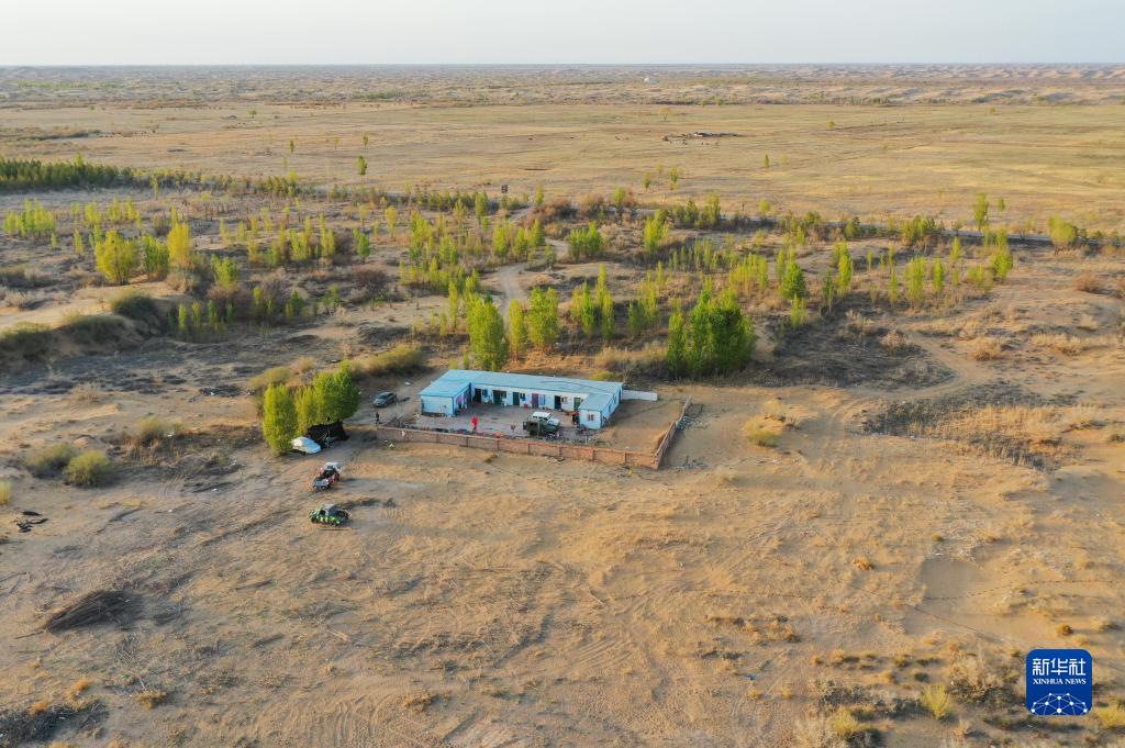 这是朱虎明团队居住的临时板房,位于库布其沙漠亿利生态治理区(4月25日摄,无人机照片)。