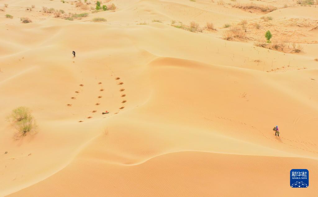 治沙客在内蒙古库布其沙漠亿利生态治理区种植苗木(4月27日摄,无人机照片)。
