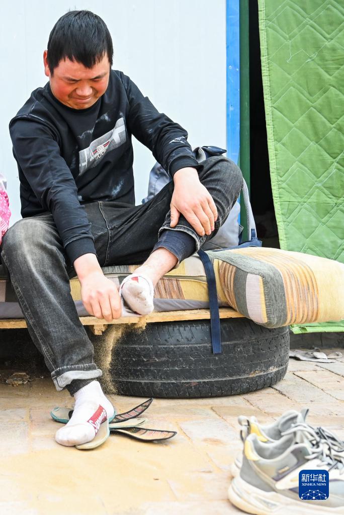 干完活回到临时板房后,治沙客周斌禄清理鞋中的沙子(4月27日摄)。