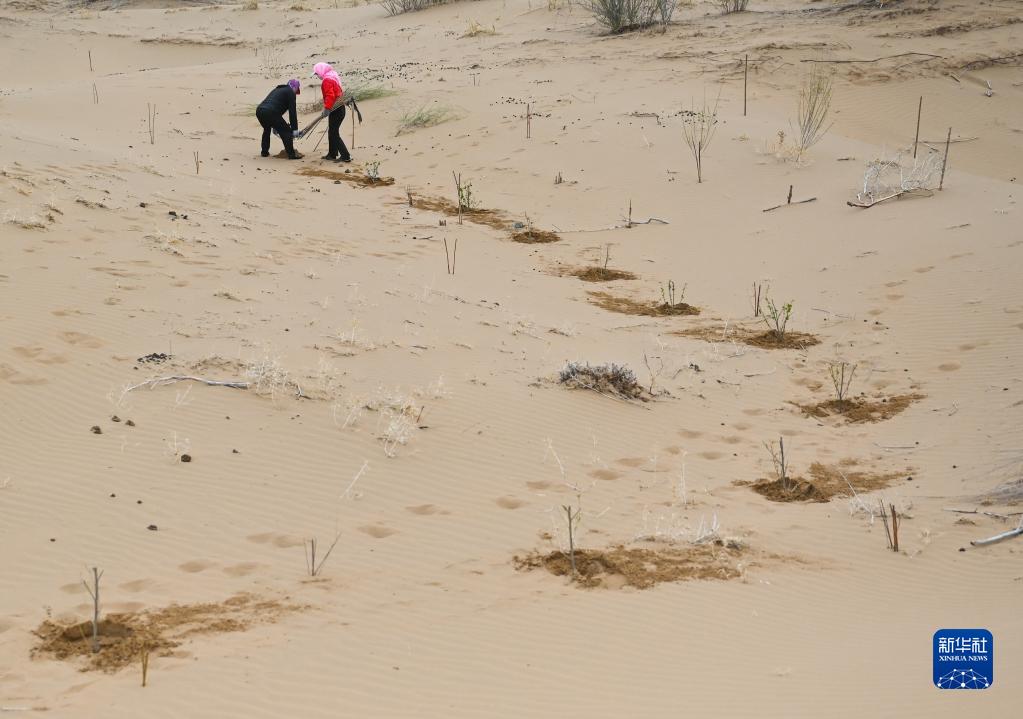 治沙客在内蒙古库布其沙漠亿利生态治理区种植苗木(4月27日摄)。