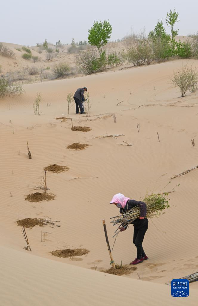 治沙客胡生宗夫妻两人在内蒙古库布其沙漠亿利生态治理区种植苗木(4月27日摄)。