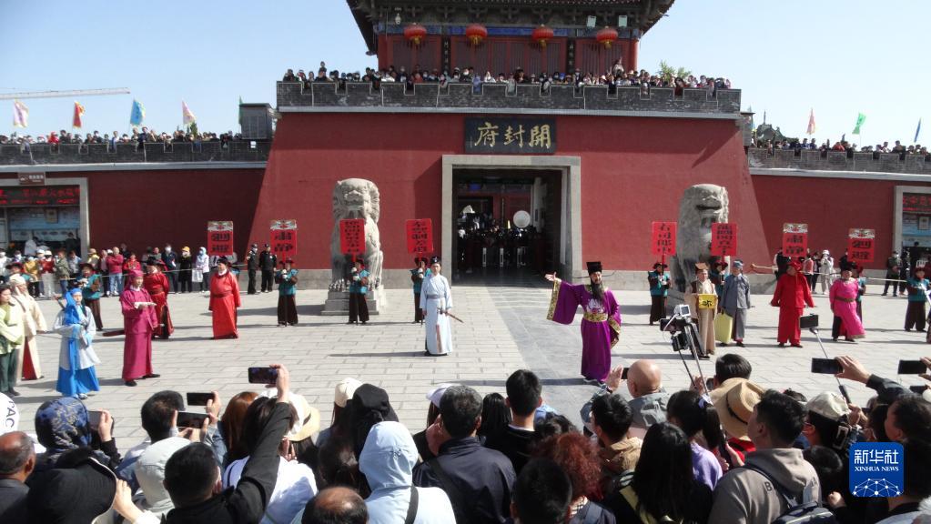 4月29日,众多游客在河南省开封市开封府景区门前观看《包公迎宾》仪式。