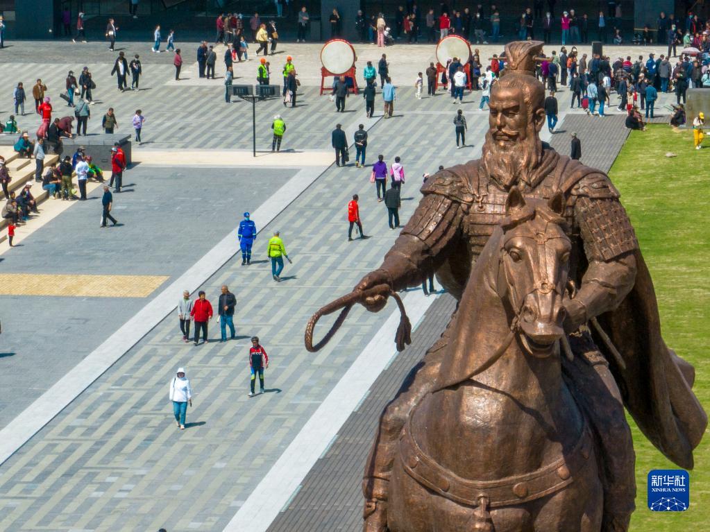 4月29日,河南省安阳市曹操高陵遗址博物馆吸引了众多游客(无人机照片)。