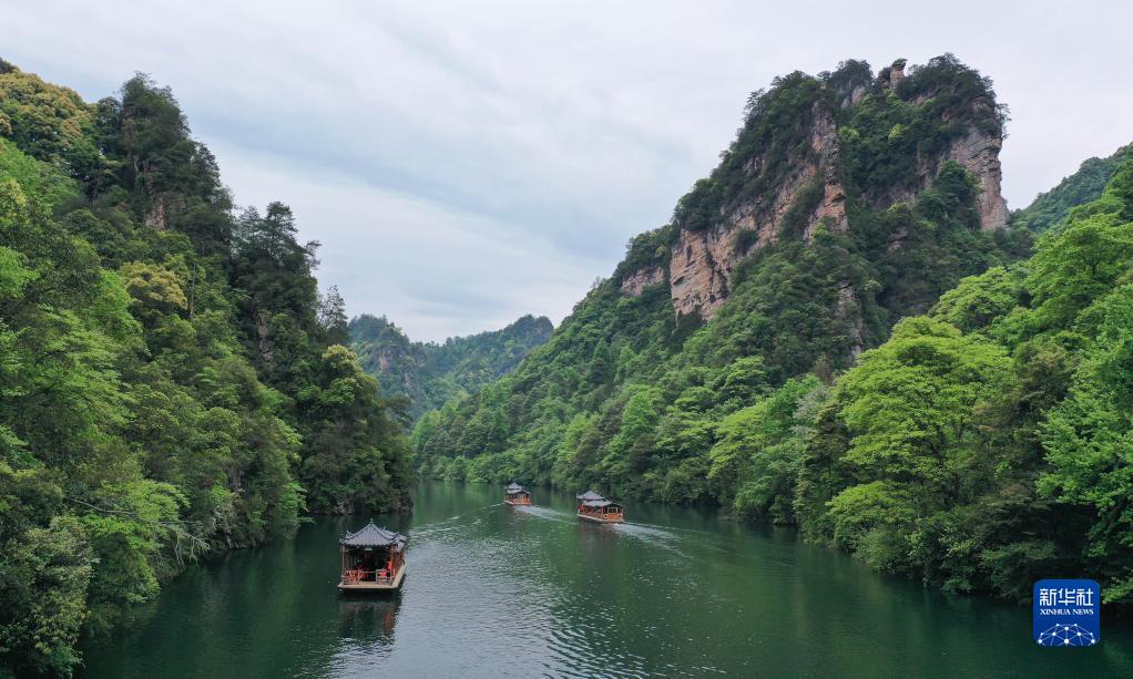 4月29日,游客在湖南张家界宝峰湖景区乘船游览(无人机照片)。